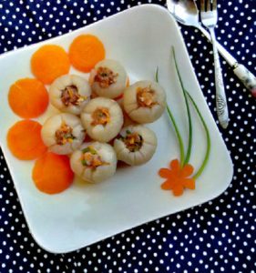 + Rau cải đem luộc chín, bày lên cạnh đĩa, vải nhồi tôm, đổ nước sốt lên trên rồi ăn ngay khi còn nóng.